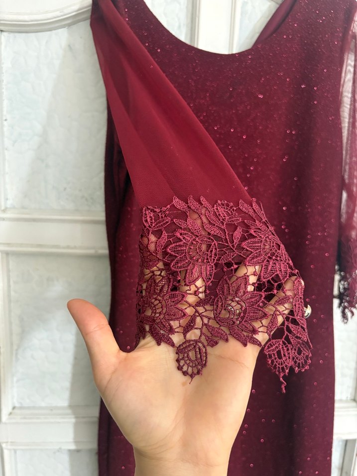 Bordo renk, dantelli uzun kollu, nakış detaylı, V yakalı, midi boy, bohem tarzda klasik şıklık sunan elbise.