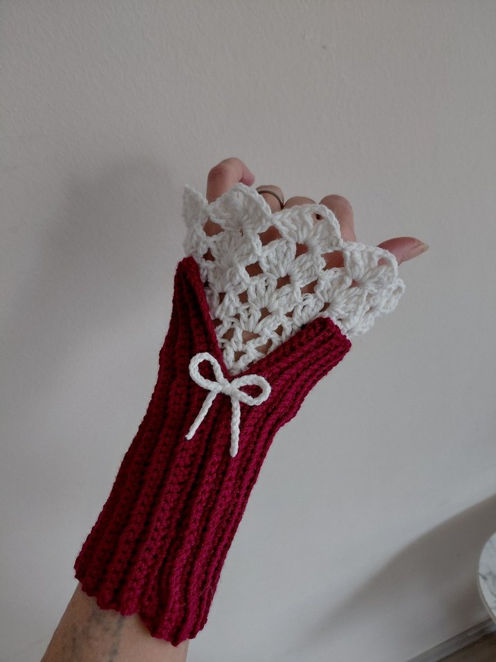 Beyaz dantel detaylı ve küçük fiyonk süslemeli, bordo renkli örgü kadın eldiven. Rahat bohem tarzda.