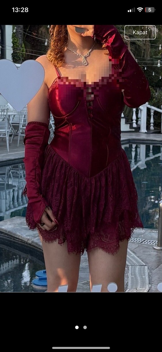Bordo renkli, straplez ve dantelli detaylara sahip, vücuda oturan gotik mini elbise. Midi etek kısmı ve sentetik kumaş kullanılmış.Sadece Mezuniyette giydim M beden