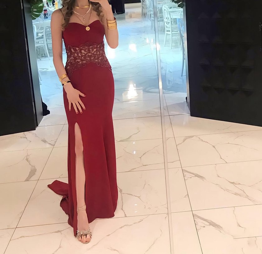 Bordo renk, straplez yakalı, bel kısmı dantelli uzun ve dar kesim abiye elbise. Önünde yırtmaç bulunan, klasik ve modern tarzda, düğün için uygun. Arkası da önü gibi taşlı 2 kez giydim