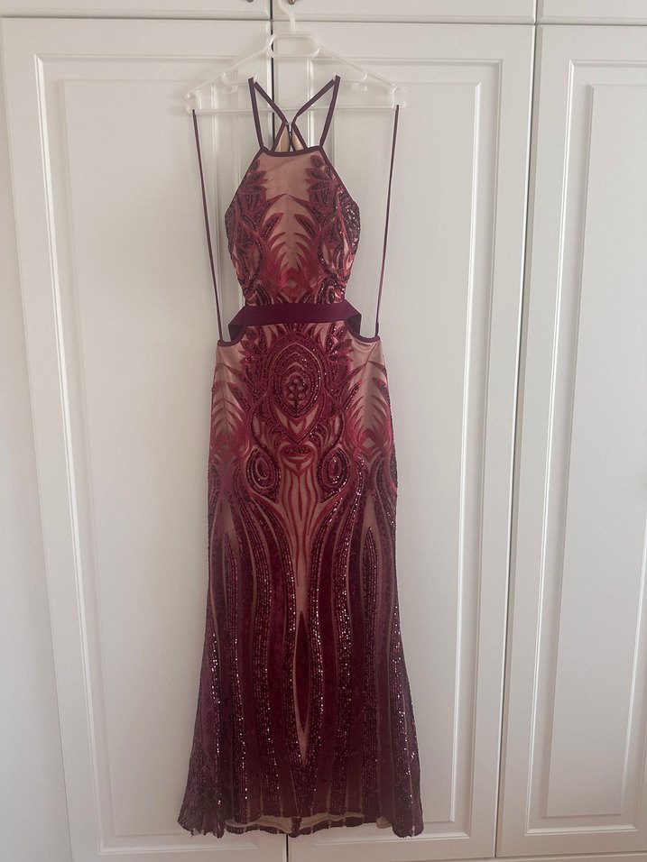 Bordo renkli, dantelli ve işlemeli detaylara sahip, yüksek yakalı ve ince askılı, uzun ve vücuda oturan bohem parti elbisesi.