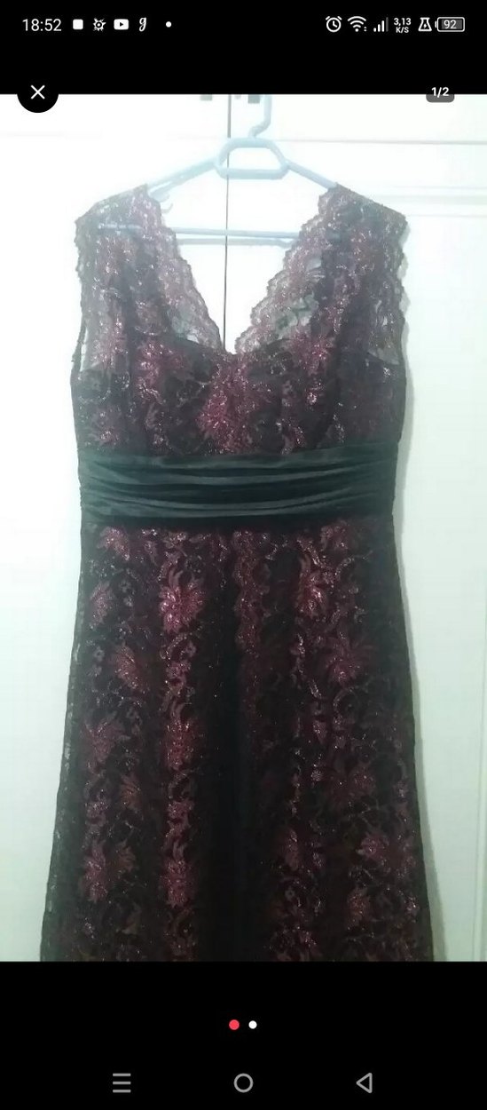 Bordo renkte, dantelli ve v yakalı, kolsuz midi elbise. Oturaklı kesimi ve koyu tie-dye deseniyle gotik parti tarzına uygun.abiye 40 beden yepyeni uzun