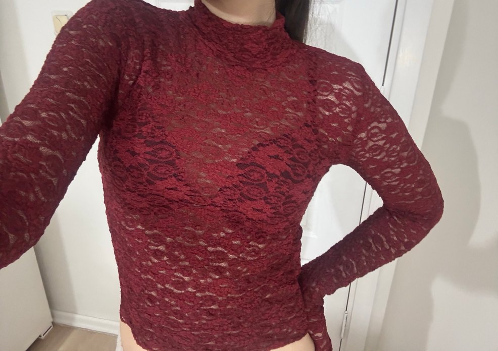 Bordo dantelden yapılmış, yüksek yakalı ve uzun kollu, vücuda oturan kadın bluz. Koyu, desensiz tasarımı cesur gotik tarzlara uygundur, romantik akşamlar için idealdir.