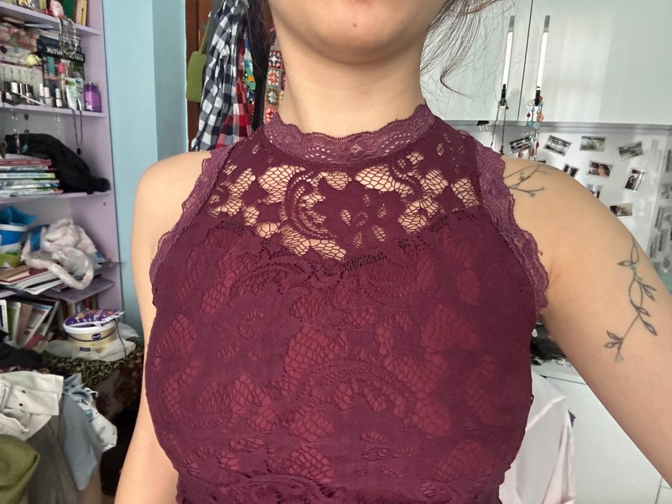 Mürdüm renginde, dantelli, yüksek yakalı ve kolsuz, vücuda oturan bluz. Romantik bir akşam için uygundur. Gotik bir bluz