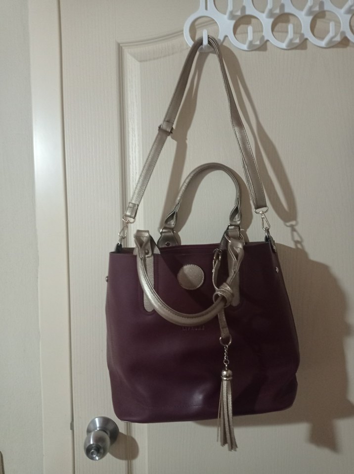 bordo kadın çanta, püskül detayı ve ayarlanabilir askıyla hem elde hem omuzda taşınabilir. Minimalist ve çağdaş tasarım, günlük kullanıma uygun.
