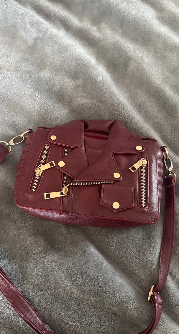 Bordo deri çanta, biker ceket tarzında fermuarlı detaylar ve altın renkli aksesuarlarla. Çıkarılabilir askılı, desen içermeyen şık tasarım, günlük kullanım için uygun. Biraz hasarlı