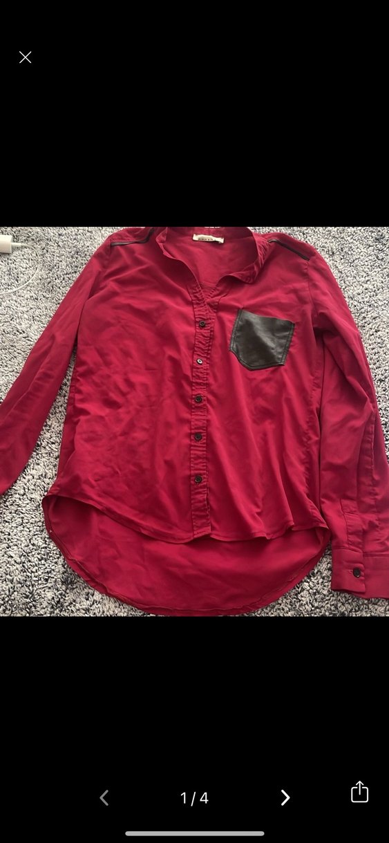 Bordo renkli, uzun kollu ve düğmeli kadın gömlek, deri cep detayı ve normal uzunlukta salaş kesime sahiptir. Günlük sokak stiline uygundur.
