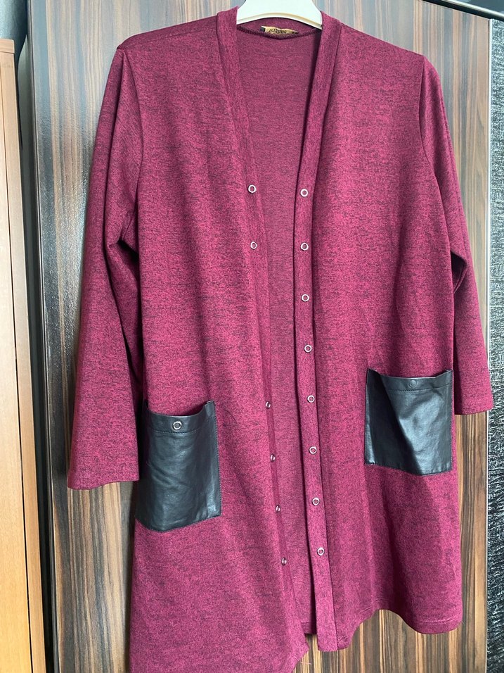 Bordo renkli, düğmeli, bol kesim uzun kadın ceket. Tek cebinin düğmesi düşmüştür.48-52 beden aralığındadır.Siyah deri cepler ve kesik yaka detayı bulunur. Rahat ve şık sokak stili için uygundur.