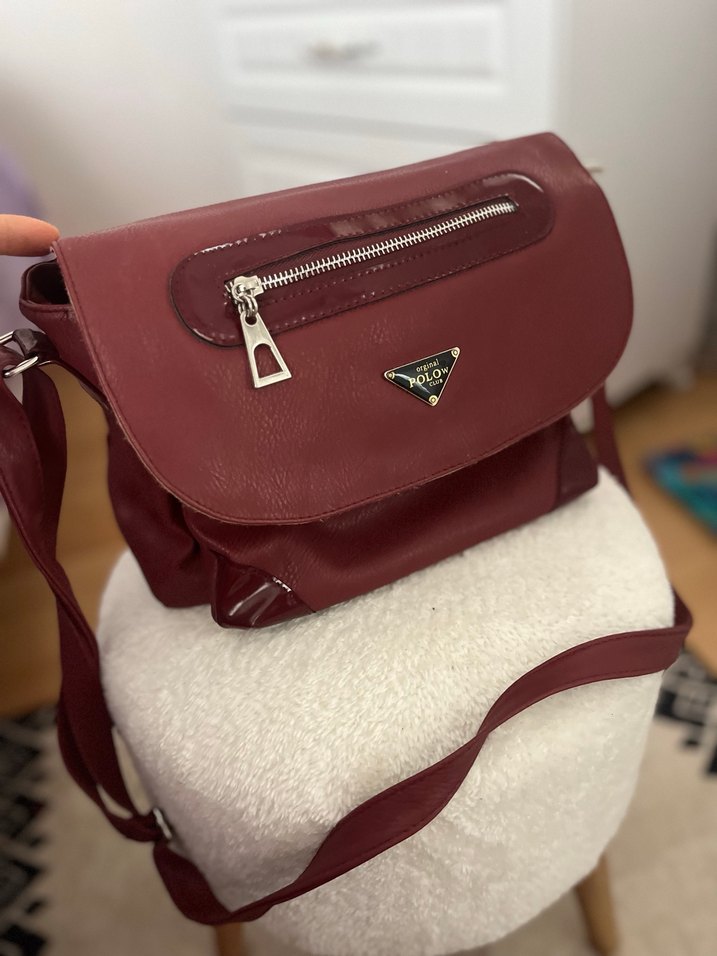 Bordo deri omuz çantası, parlak yüzeyli ve tokalı detaylara sahip. Önünde fermuarlı cep ve baskılı logo bulunur. Trendy sokak stiline uygun. Çok gözlüdür