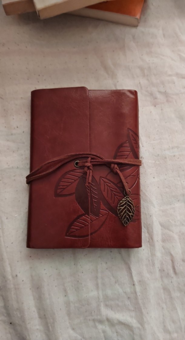 Bordo renkte, deri görünümlü kapaklı, kabartmalı yaprak desenli ve yaprak figürlü bağlama ipli defter.