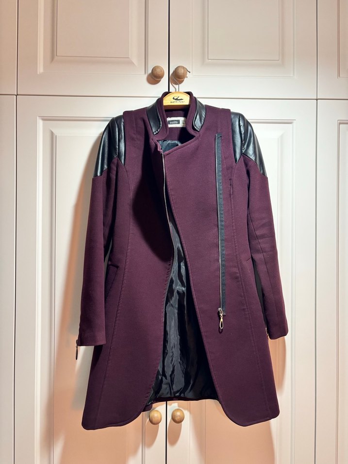 Bordo renkte, deri detaylı, normal boy midi kaban. Notlu yaka ve fermuarlı, strappy kollu, düzenli kesimle goth ve Paris tarzını yansıtıyor.