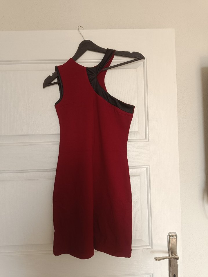 Bordo renk, yüksek yakalı ve kolsuz, asimetrik drapeli detaylı, vücuda oturan midi elbisedir. Romantik akşamlar için uygundur. ürün bir kez kullanılmıştır