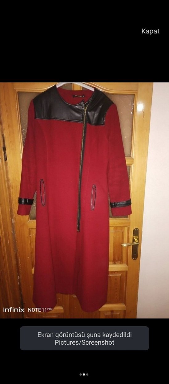 Bordo renkli uzun kaban, deri detaylı omuz ve manşetlere sahip, çıtçıtlı yaka ve asimetrik fermuar kapamalı. Regular fit ve uzun kollu, günlük kullanıma uygun goth tarzda.