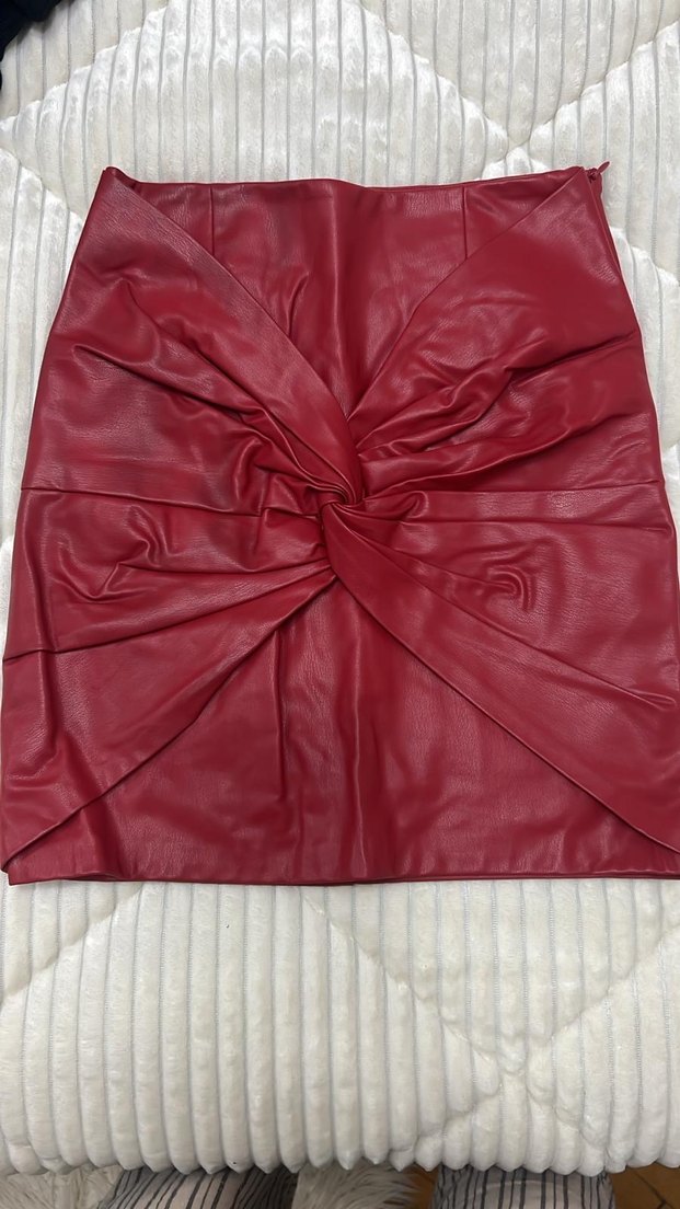 Bordo deri, drapeli tasarımlı, parlak yüzeyli, vücuda oturan mini etek. Romantik akşamlar için çağdaş Paris tarzı midi boy.