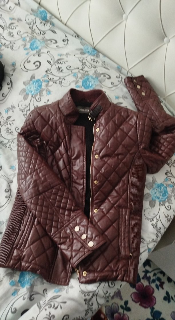 Bordo deri, düğmeli, kapitone desenli biker ceket, uzun kollu ve kesimli, günlük kullanıma uygun şık bir modeldir.