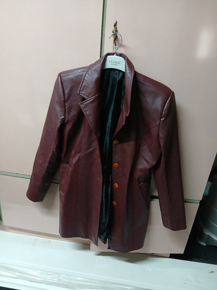 Bordo deri ceket, düğmeli ve kesik yaka detayıyla dikkat çeker. Uzun kollu, normal kesim ve midi boydadır. Ofis için uygun klasik tarzda bir dış giyim ürünü.