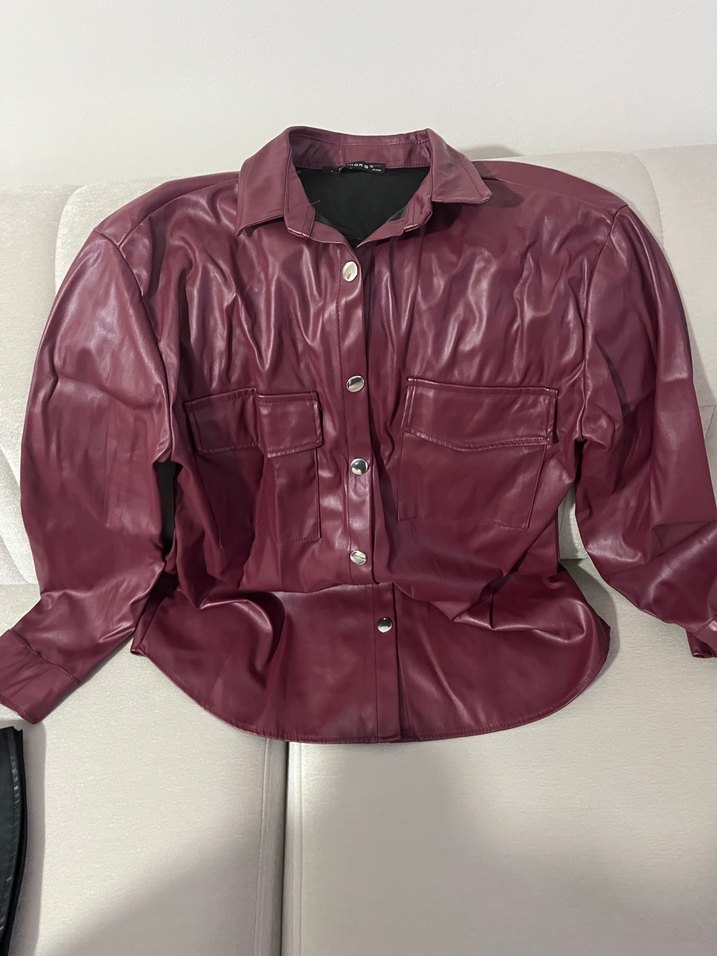 Bordo renkli deri ceket, düğmeli, yakalı ve uzun kolludur. Salaş kesimiyle günlük sokak stiline uygun, normal boyda bir parçadır.