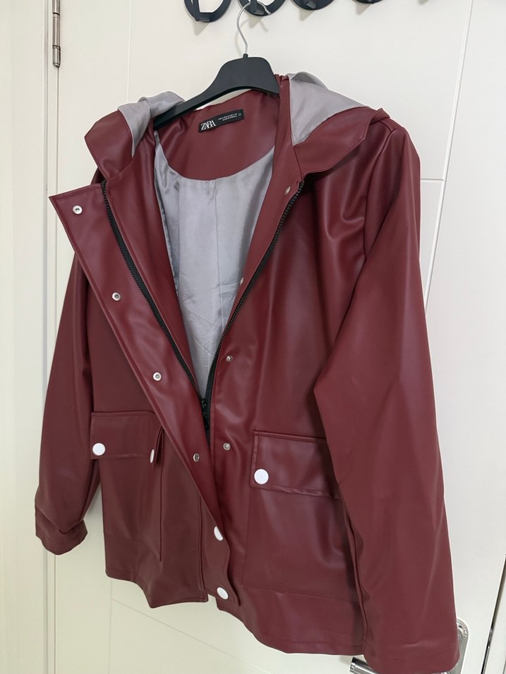 Bordo deri, düğmeli ve normal boy midi yağmurluk. Geniş kesim, uzun kollu ve çıtçıt detaylıdır. Gri iç astar ile sade tasarım sunar. ️