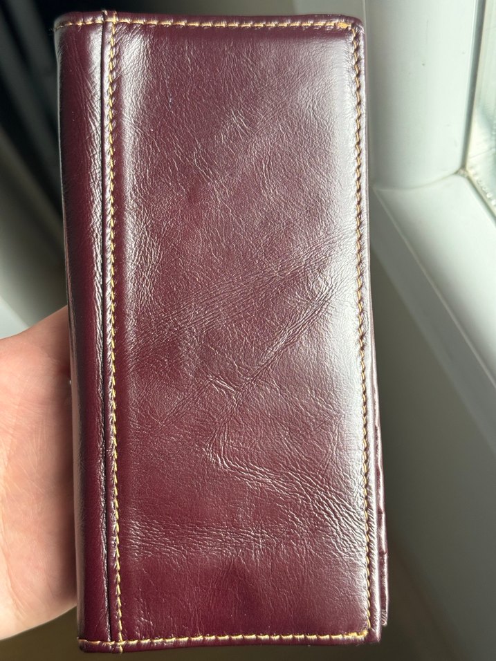 Bordo renkli, parlak deri cüzdanı fermuarlı kapanışa sahip, klasik ve sade tasarımla günlük kullanıma uygundur.