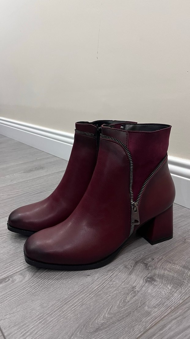 Bordo deri kadın botlar, blok topuklu ve fermuarlı tasarıma sahip, romantik akşamlar için şık ve minimalist bir görünüm sunar. ✨ Hediye geldi hiç kullanmadım. Topuk boyu 6 cm’dir. Kaymaz tabandır. Defosu hiç yok içi sıcak tutucu tüylüdür. Kutusu ile birlikte vereceğim.