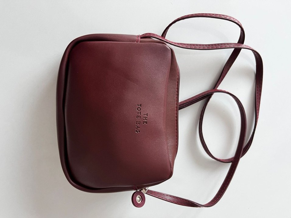 Bordo deri fermuarlı kadın çanta, üzerinde 'THE TOTEBAG' baskılı yazı bulunur. Günlük sokak stili için sade ve şık bir tasarıma sahiptir.