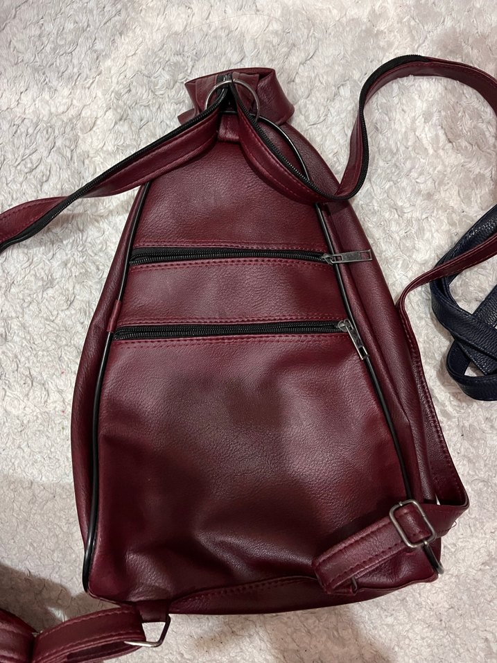 Bordo deri kadın sırt çantası, fermuarlı cepler ve sade biker tarzıyla günlük kullanıma uygundur.