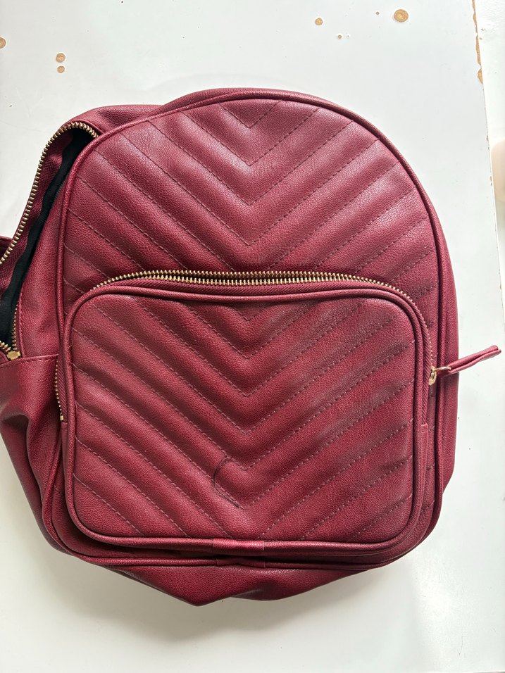 Bordo renkte, fermuarlı ön cepli, deri malzemeden yapılmış sade ve minimalist sırt çantasıdır.