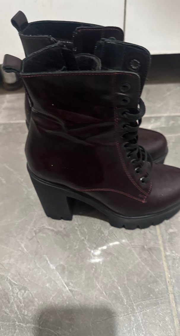 Bordo deri kadın bot, kalın topuklu ve tokalı detaylıdır. Gotik tarzda, bağcıklı ve desen içermeyen şık bir modeldir.