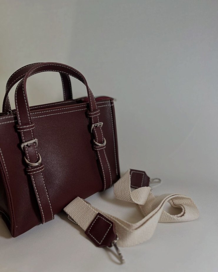 Koyu bordo deri kadın çanta, tokalı detaylara ve çıkarılabilir bej askıya sahiptir. Günlük kullanıma uygun sade, çağdaş Paris tarzında.