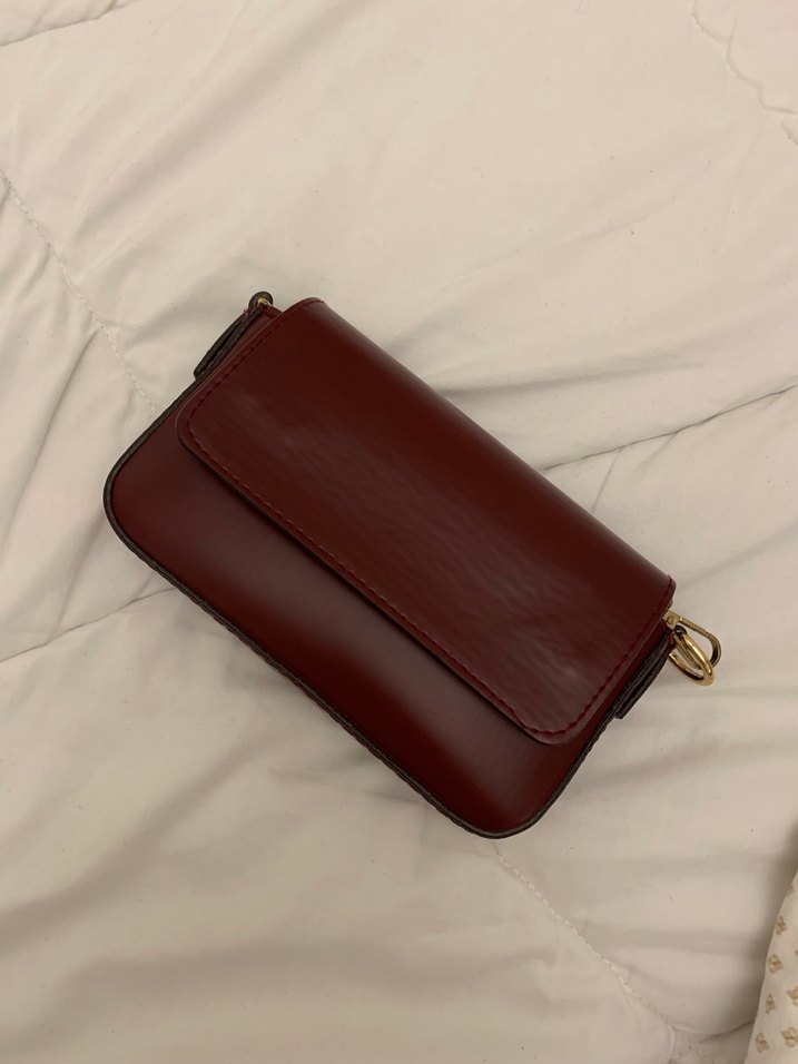 Bordo deri, tokalı kapaklı ve desen içermeyen bu kadın çantası, minimalist ve modern klasik tasarıma sahiptir. Günlük kullanıma uygundur.