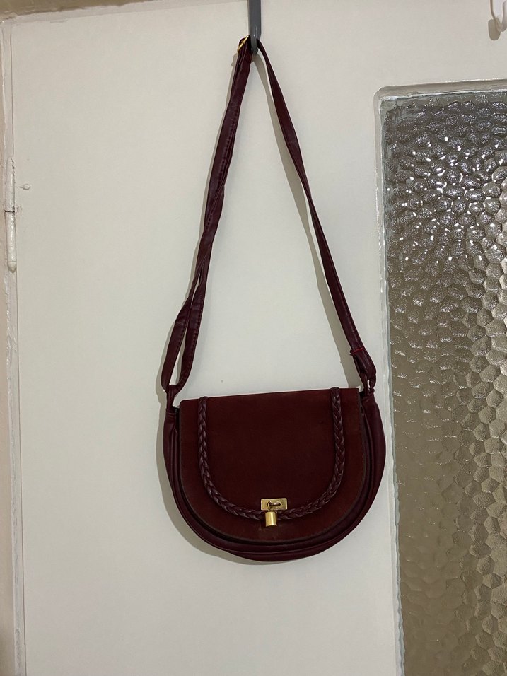 Bordo deri kadın çanta, tokalı detayları ve parlak yüzeyiyle bohem Paris tarzını yansıtıyor. Günlük kullanıma uygun.