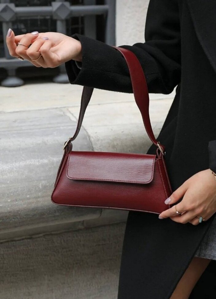 Bordo deri kadın çanta, tokalı askısı ve modern klasik tasarımıyla günlük kullanıma uygundur. Koyu ve desensiz yüzeyi zamansız şıklık sunar.