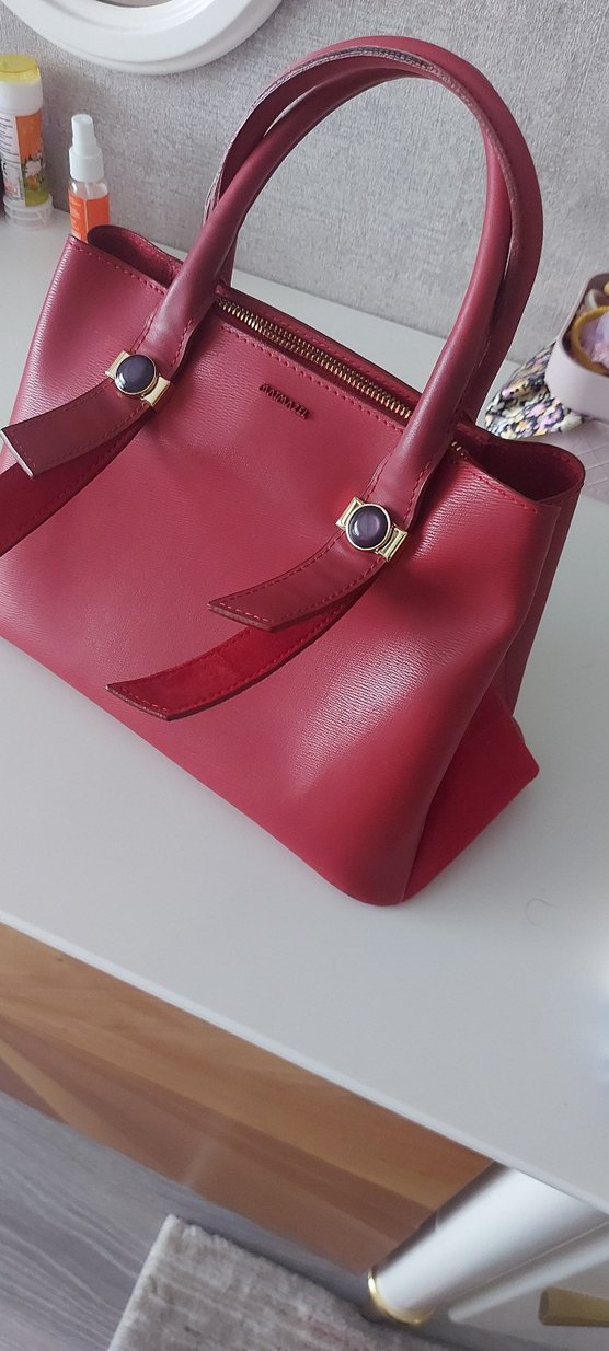 Bordo deri kadının çantası, tokalı saplarla modern klasik tarzda, günlük kullanım için uygun. Minimalist ve şık, hafif baskılı detaylarla.