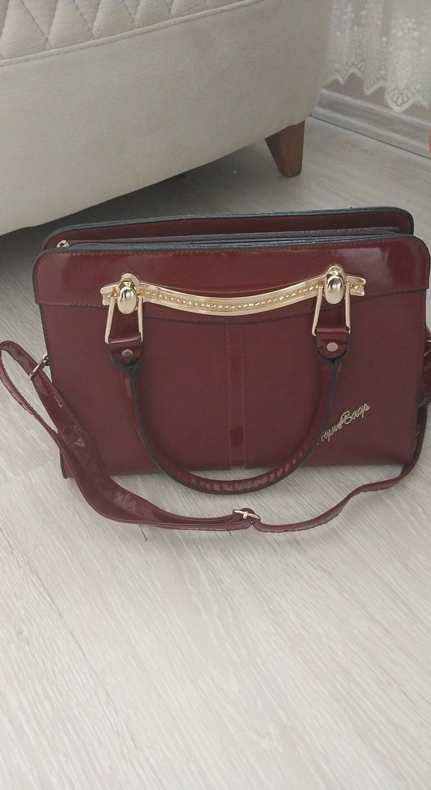 Bordo deri çanta, parlak yüzeyli, tokalı kulplu ve baskılı desene sahip, günlük kullanım için çağdaş ve klasik bir tarz sunar.