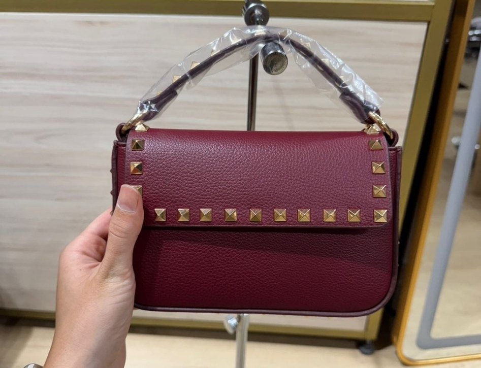 Bordo deri kadın çanta, parlak yüzeyli ve tokalı detaylara sahip, modern klasik tarzda.