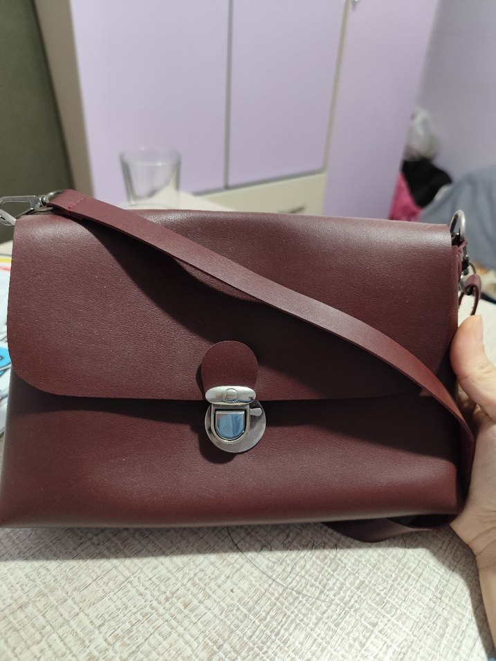 Bordo renkli, tokalı kapaklı, minimalist ve çağdaş tasarıma sahip deri kadın çantası. Günlük kullanım için uygundur. İçi geniş ve ortasında fermuarli yeri var