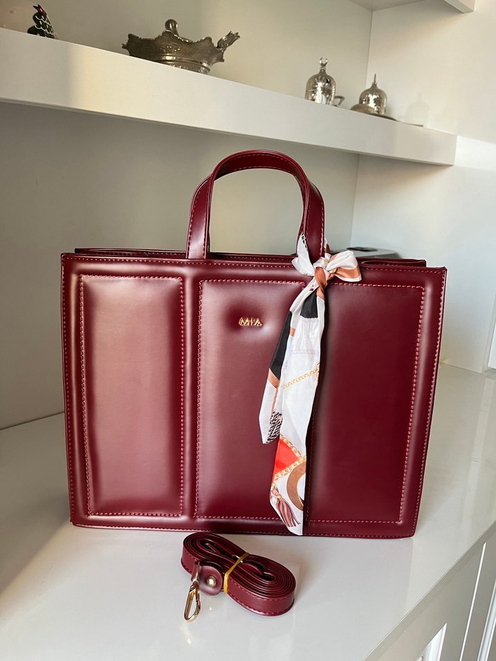 Bordo deri çanta, tokalı tasarımı ve desenli fular detayı ile modern klasik tarz sunar. Günlük iş kullanımı için uygundur. Ayarlanabilir askı dahildir.