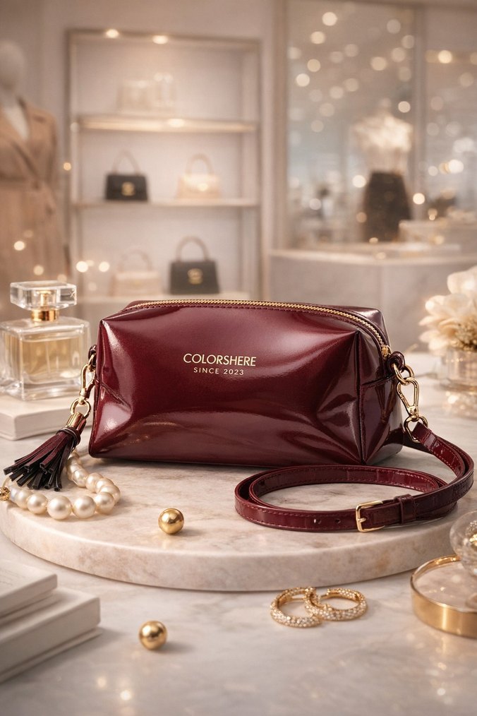 Bordo deri kadın çanta, parlak yüzey, püskül detayı ve baskılı desen içerir. Modern klasik tarzıyla günlük kullanıma uygundur.