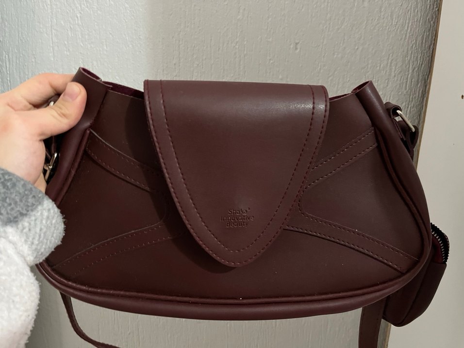 Bordo deri malzemeden yapılmış, tokalı küçük cüzdan tarzı bölmeside vardır kapaklı modern klasik tasarıma sahip kadın çantası. "Shaka" logosu bulunur, günlük kullanıma uygundur.