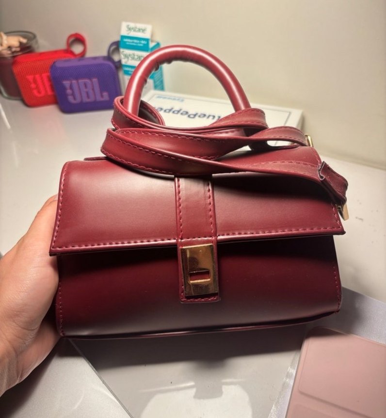 Bordo renkte deri kadın çanta, tokalı kapanışlı ve kompakt tasarımlı. Cesur Paris tarzına uygun, UBL işaretli.