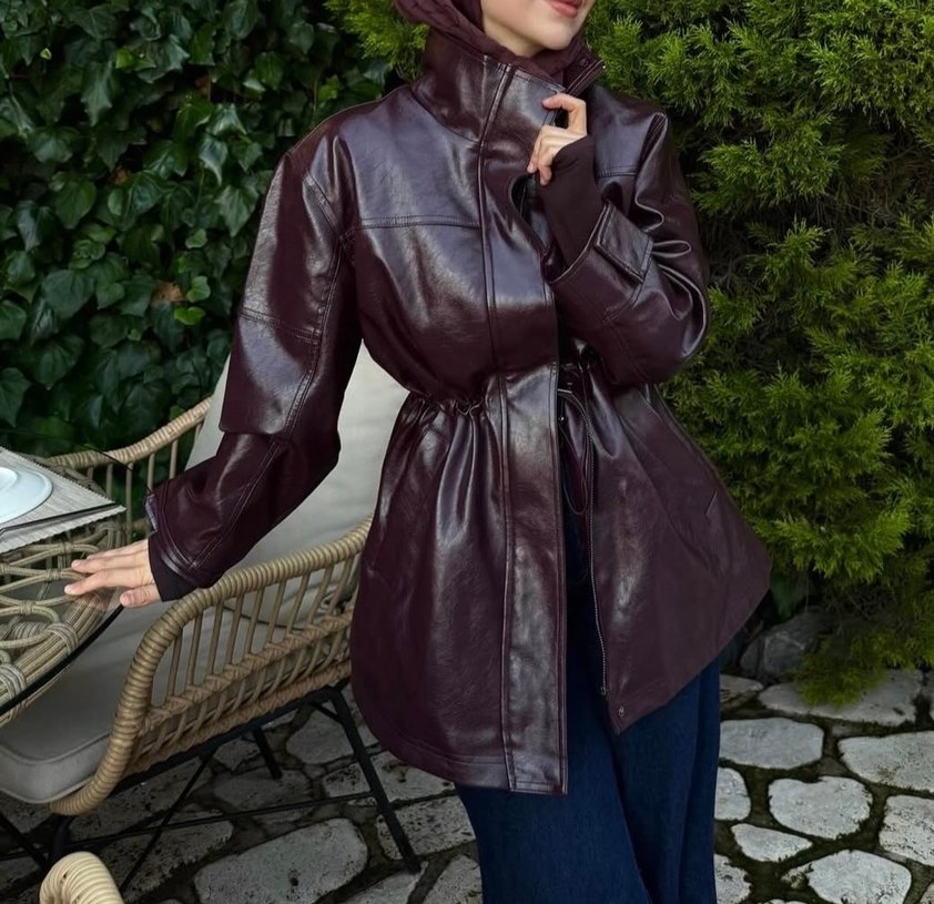 Bordo deri kadın ceket, yüksek yakalı ve askılı kollu, regular fit kesimlidir. Günlük kullanım için uygun sokak stiline sahiptir.