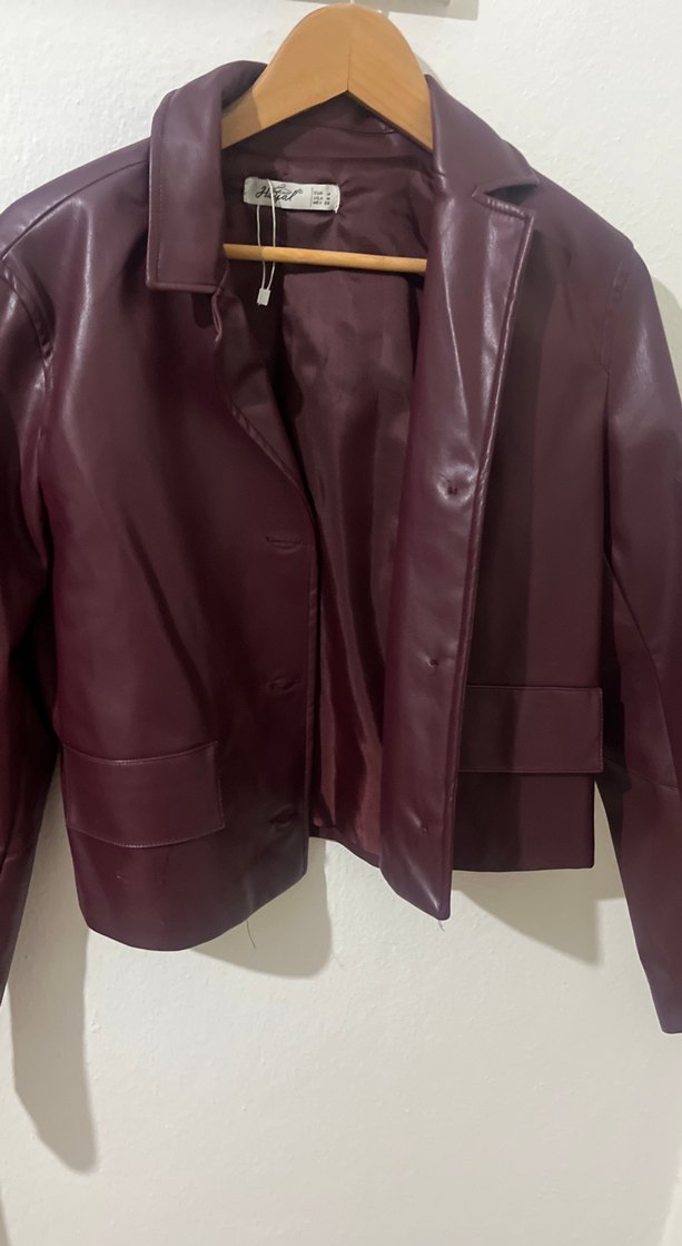 Bordo deri ceket, kesik yaka ve düğmeli kapamalıdır. Kısa boy, regular fit ve askılı kollara sahiptir, ofis kullanımı için uygundur.