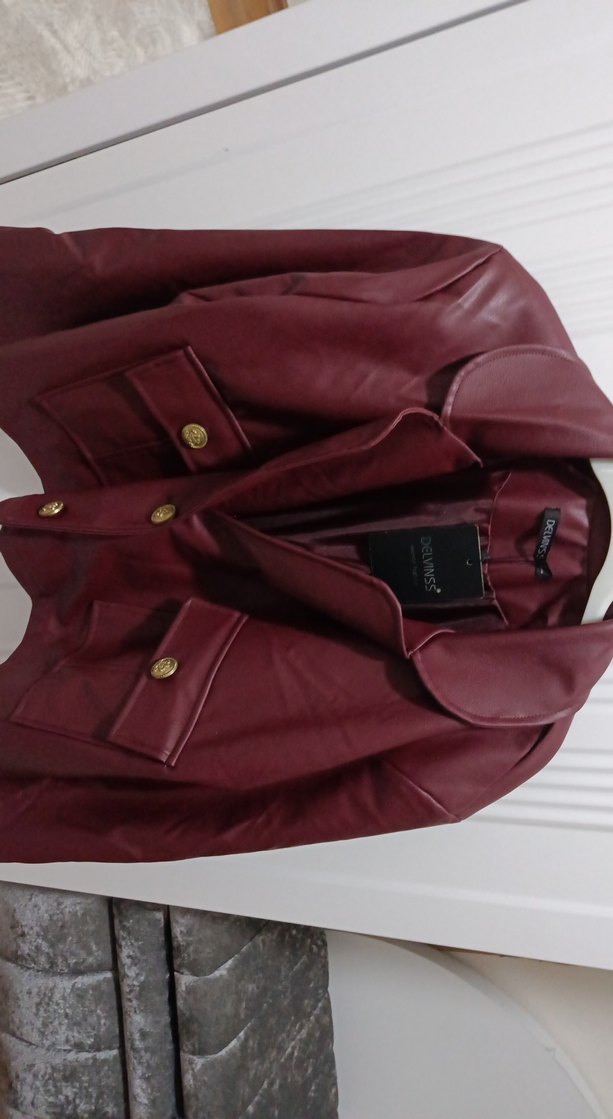 Düğmeli cepleri ve keskin yaka detayı olan bordo deri ceket, ince kesim ve midi boyda, ofis ya da günlük kullanıma uygun.hiç kullanılmamış