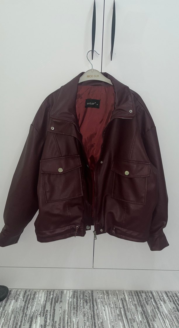 Bordo renkli deri ceket, düğmeli cepler ve kesik yaka ile regular fit kesime sahiptir. Uzun kollu ve midi boyda, günlük sokak stili için uygundur.