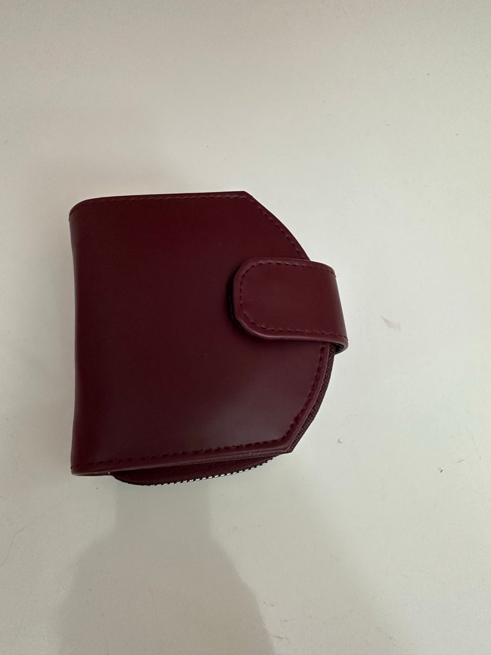 Bordo deri kadın cüzdanı, tokalı kapama ve minimalist desensiz tasarıma sahiptir. Günlük kullanıma uygun, koyu renkte sade bir modeldir. İçinde 9 sayısı görünür.