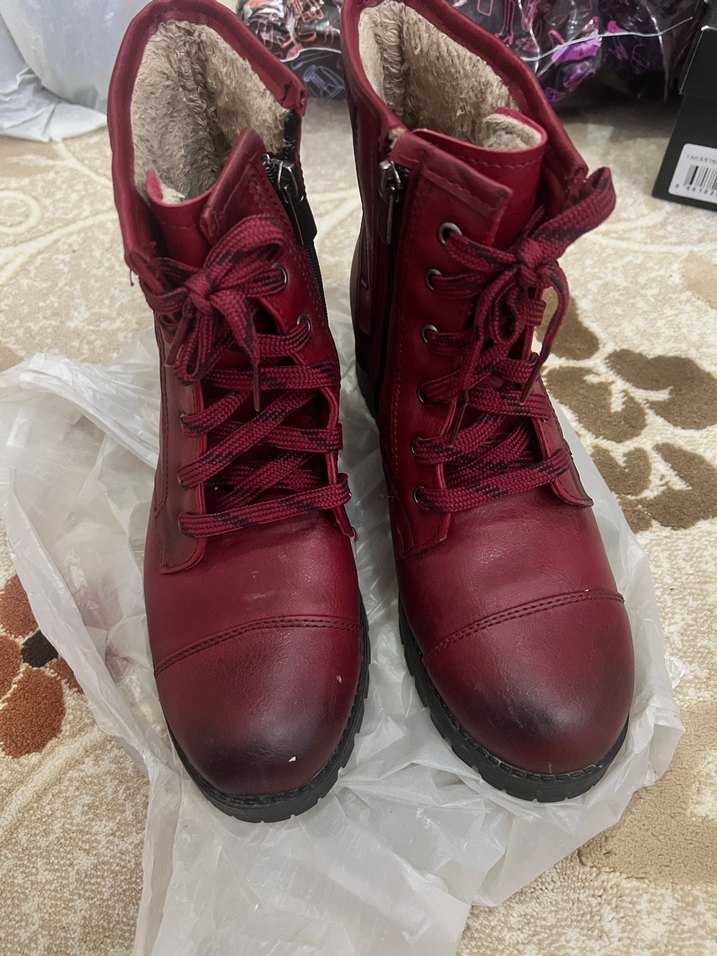 Bordo deri kadın botlar, dolgu topuklu ve tokalıdır. İç kısmı sıcak tutan yumuşak astarlıdır, günlük kullanıma uygundur. 39 yazıyor ama dar kalıptır 38 olur