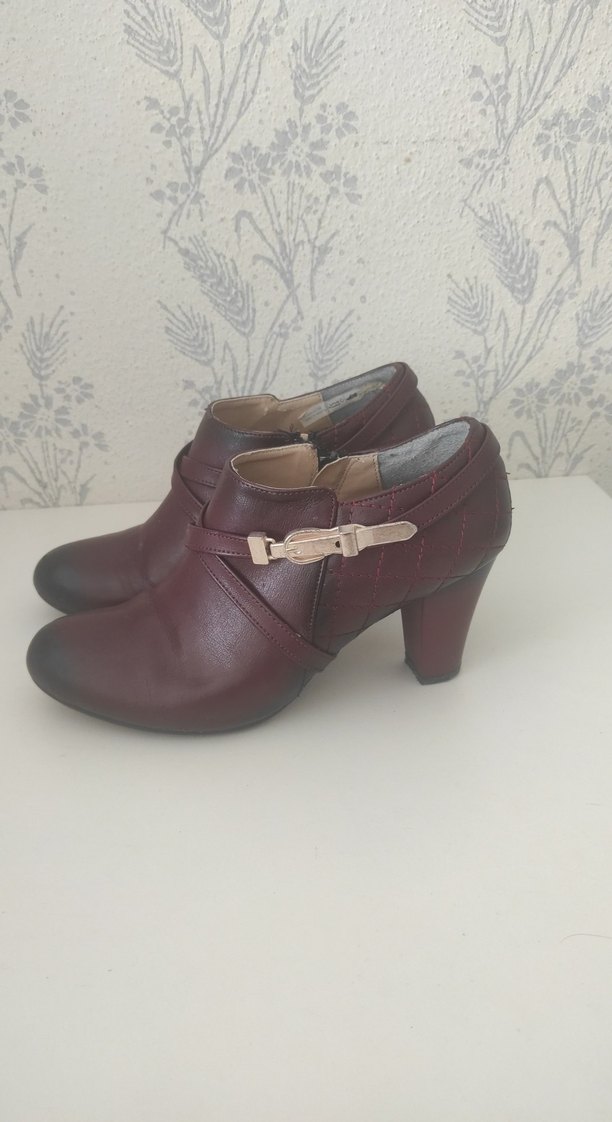 Bordo deri, tokalı ve dolgu topuklu kadın botları. Minimalist ve normcore tarzıyla günlük kullanıma uygundur. 4 kez bir iki saatliğine giydim son fotoğrafta bir iki yerinde ufak soyluma var detaylı çektim başka bir sorunu yok