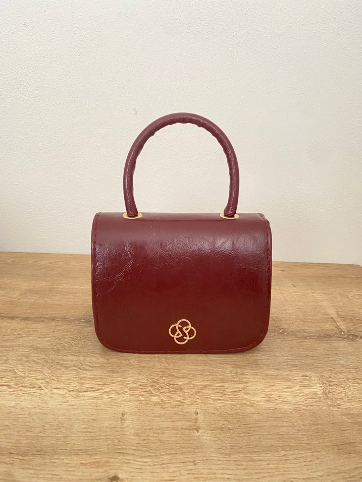 Bordo deri, tokalı ve baskılı desenli kadın el çantası, parlak ve modern klasik tarzıyla romantik akşamlar için uygun.