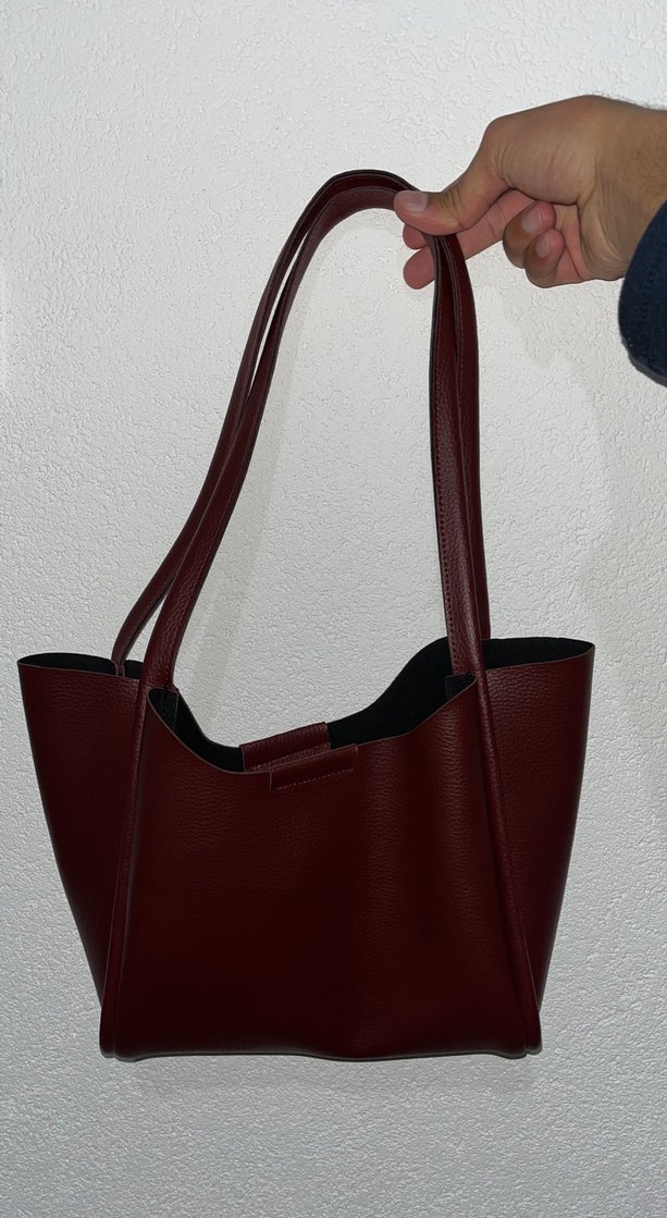 Bordo deri kadın el çantası, uzun saplı ve desensiz tasarıma sahip. Günlük kullanım ve rahat sokak stili için şık bir seçimdir. İki kere taktım veya takmadım