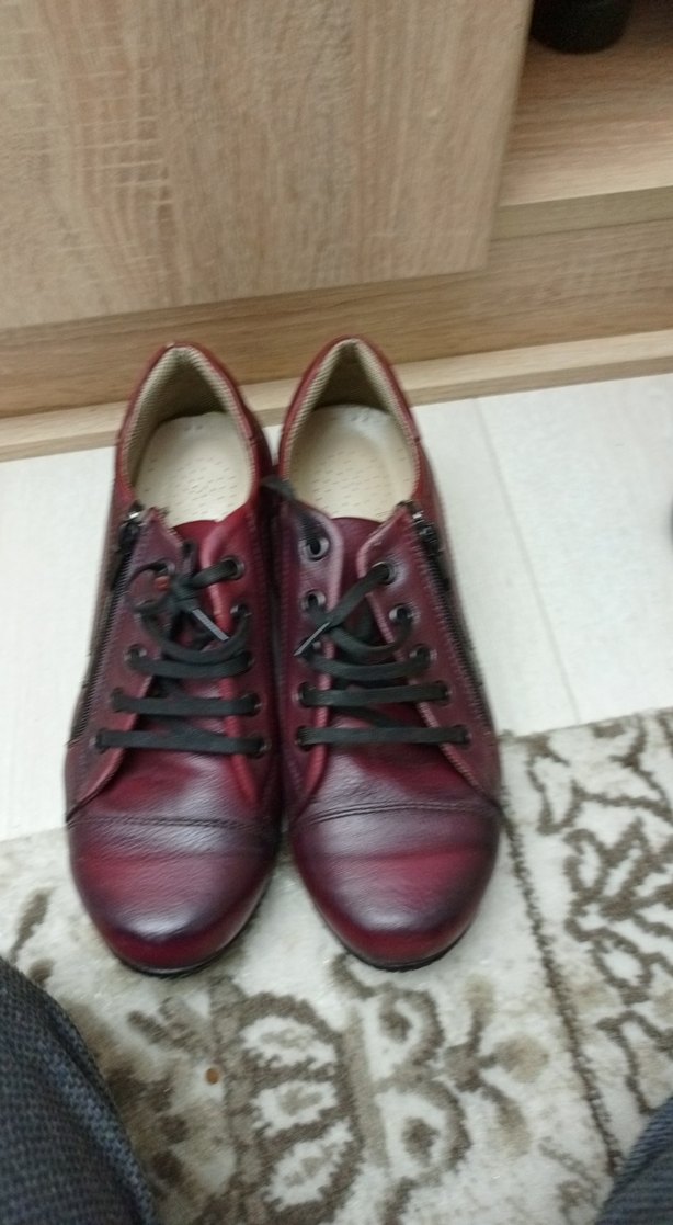 Bordo deri, dolgu topuklu, bağcıklı kadın günlük ayakkabısı. Geleneksel tarzıyla her gün kullanılabilir.